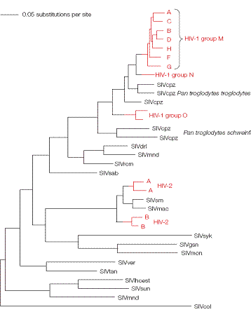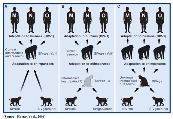 Although there are two distinct HIV viruses, (HIV-1 and HIV-2) HIV-1 has proven to be substantially more devastating (9). Both HIV-1 and HIV-2 are classified as zoonotic diseases as they are the result of cross species transmission events of lentiviruses from non-human primates. Through extensive research it was determined that HIV-2 originated in SIVsm of sooty mangabeys (Cercocebus atys). Additionally, empirical evidence suggests that there have been at least 8 cross species transmission events of SIVsm (3). Conversely, researchers have ascertained that HIV-1 is a derivative of a specific strain of simian immunodeficiency virus (SIVcpz) from a sub-species of chimpanzee (Pan troglodytes troglodytes) (3; 9; 10). HIV-1 crossed the species boundary and entered the human population on a least 3 independent occasions (3; 9). Each transmission event gave rise to a different group of HIV-1; M, N, O. Notably, although HIV-1 group M is a product of only one of the cross-species transmission events, HIV-1 group M is also progenitor of the current AIDS epidemic (3; 9; 10). Since it emergence, HIV-1 group M has diverged into 11 subtypes due to the diversifying selection pressure placed on the virus by its host in addition to having undergone numerous recombination events (3). The figure which is adapted from Sharp et al. illustrates the phylogenetic relationship that exists between the HIV-1 variants as well as how these variants are situated with respect to different strains of SIV viruses As it is now clear that HIV-1 is derived from SIVcpz, attention has turned to the disentanglement of the origin SIVcpz as well as the source of the SIVcpz reservoir. SIVcpz is hypothesized to be a recombinant virus comprised of lentiviruses from the red capped mangabey (SIVrcm) and at least one lentivirus from the spot nosed monkey, or a closely related lineage (SIVgsn) (3; 9). Data from Heeney et al. demonstrates that chimpanzees can be simultaneously infected by multiple lentiviruses, thus it is possible that the recombination event that gave rise to the contemporary form of SIVcpz occurred in chimpanzees (3). If this hypothesis is correct, chimpanzees would represent the current SIVcpz reservoir. Although the aforementioned theory is widely accepted, the limited distribution of SIVcpz within the chimpanzee population (SIVcpz is only prevalent in 2 of the 4 chimpanzee sub-species) necessitates speculation about the validity of this hypothesis (3). Accordingly, two additional hypotheses have been proposed. These hypotheses differ with respect to the location of the current SIVcpz reservoir. The first contends that chimpanzees are the current SIVcpz reservoir however, the viral recombination which gave rise to SIVcpz occurred in an intermediate host (3). Conversely, the second hypothesis suggests that a yet to be identified non-human primate is currently the location of the SIVcpz reservoir and that this primate was also the site of the recombination events that generated SIVcpz (3). Figure 2 provides a pictorial representation of the 3 hypotheses